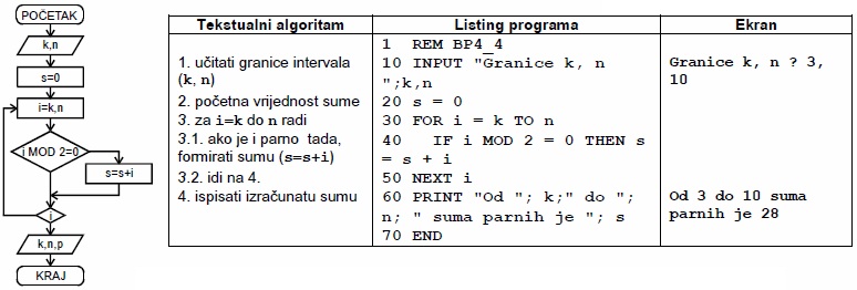 Opis programa: Po upisu granice intervala i postavlja se početna vrijednost sume (s=0). Zatim počinje FOR petlja. Prva vrijednost kontrolne varijable i je k. Naredba IF sadrži logički izraz i MOD 2 = 0. Ako je ovaj logički izraz tačan tada se uvećava suma za vrijednost kontrolne varijable i. Proces se ponavalja dok vrijednost kontrolne varijable ne bude veća od n. Ispis je na kraju.
