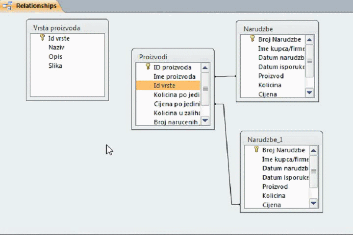 - Polje iz jedne tabele lijevim klikom prenijeti na polje druge tabele koje