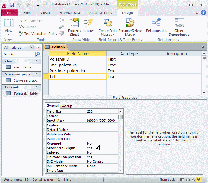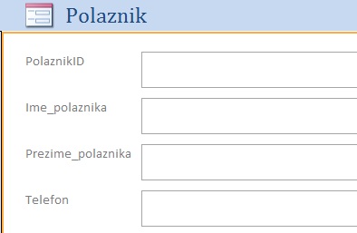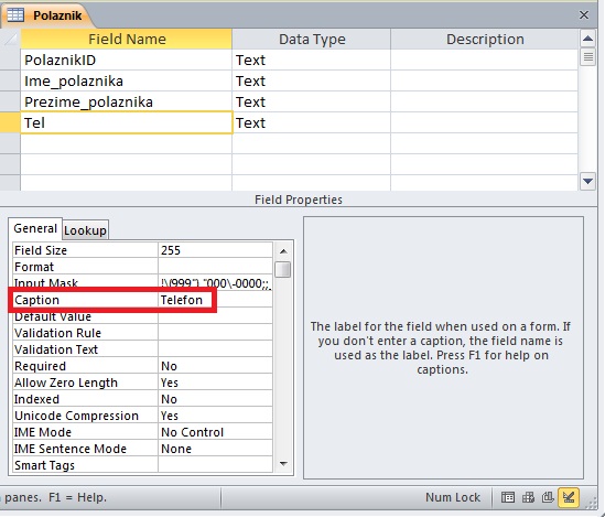 Kreiranje obrasca sa natpisom polja /WITH LABEL - CAPTION/ ima za posljedicu da su pri kreiranju formulara pojavljuje naslov polja kao tekst iz parametar CAPTION u FIELD PROPERTIES dijalog prozoru DESIGN VIEW tabele. Ovim se olakšava unos podatka .
