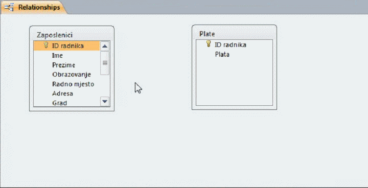 - Polje iz jedne tabele lijevim klikom prenijeti na polje druge tabele koje
