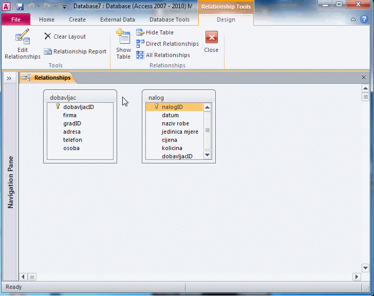 Veze između tabela možete kreirati i prevlačenjem imena polja na odgovarajuće ime polja u drugoj tabeli.