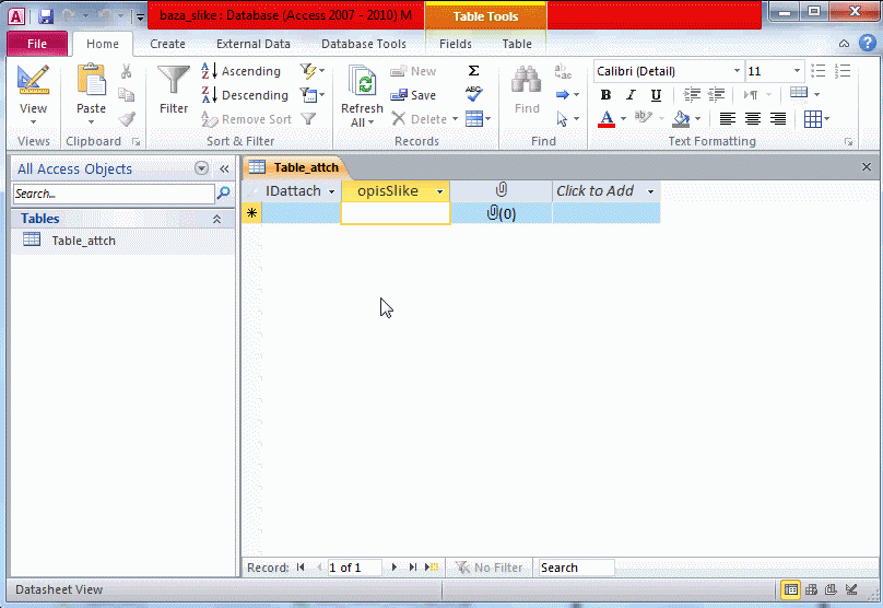 Dodavanje slike u tabeli - DATASHEET VIEW /DATASHEET VIEW - MANAGE ATTACHMENTS/, postupak: