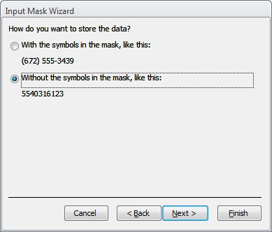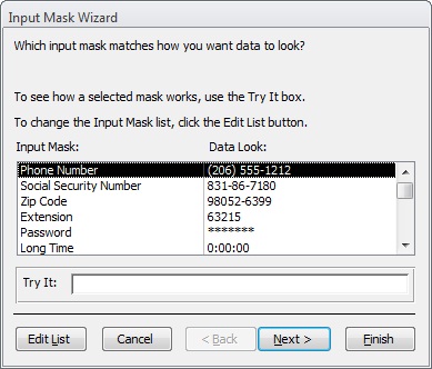 Ulazna maska /INPUT MASK/ Ulazna maska /INPUT MASK/ je namjenjena da se olakša da se svi podaci jednog polja unesu u istom obliku. Za kreiranje istovjetnog izgleda podataka polja koristi se čarobnjak INPUT MASK WIZARD dijalog prozor, koji se bira iz DESIGN VIEW.