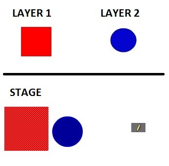 Flash. LAYER 1 sadrži crveni kvadrat, LAYER 2 sadrži plavi krug. STAGE je kao na slici. Olovka se nalazi uz ime kojeg sloja: