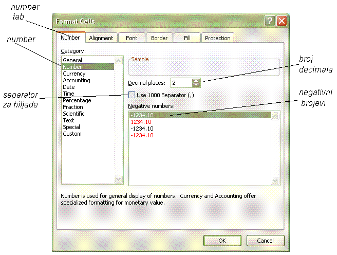 Parametri broja se u EXCEL-u podešavati u NUMBER grupe trake /RIBBON/ ili u FORMAT CELLS - NUMBER dijalog prozora.