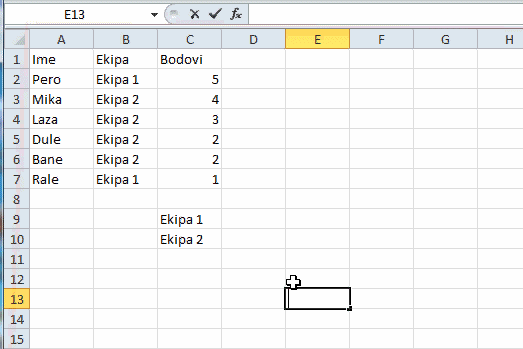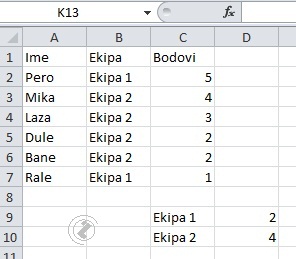 Slika 1. Rezultatti sumiranja izabranih /FUNCTION SUMIF/