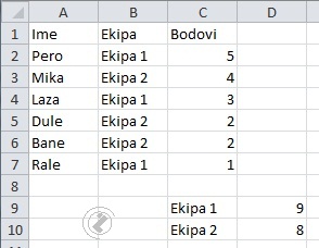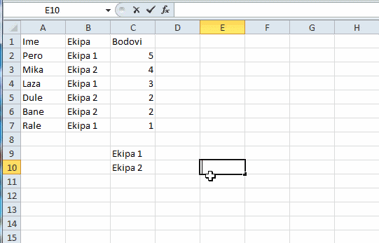 - Izabrati praznu ćeliju D10 (Ekipa 2).