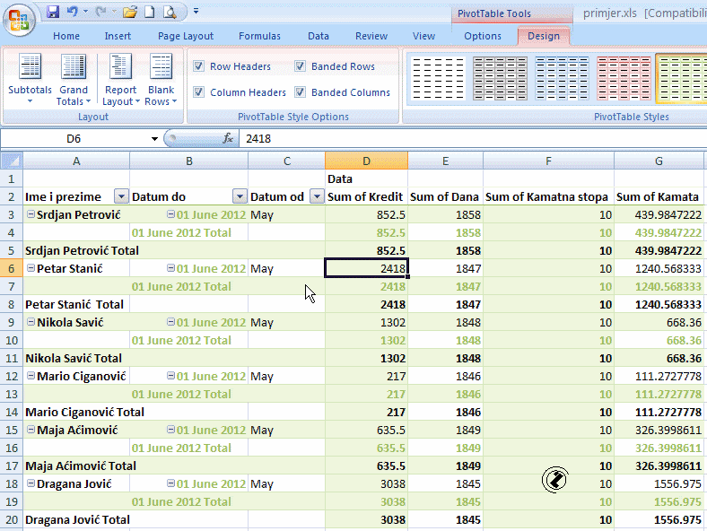 Prikaz podsuma u pivot tabeli /SUBTOTALS/, postupak:
