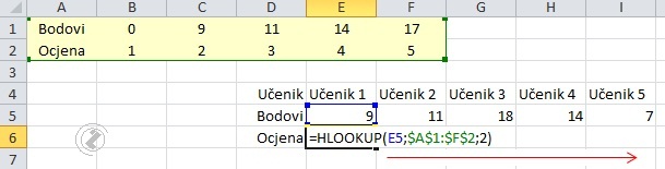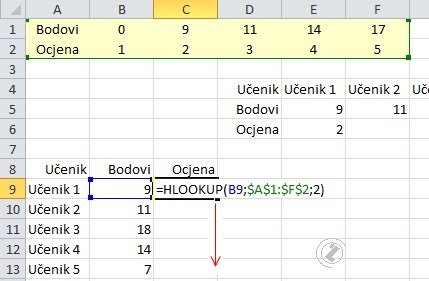 U ćeliju C9 kopirati =HLOOKUP(B9;$A$1:$F$2;2) |