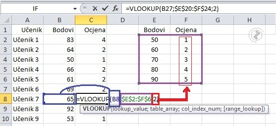 VLOOKUP funkcija u koloni C traži specifičnu vrijednost u opsegu F2:F6 na osnovu vrijednosti iz opsega E2:E6 a po zahtjevanoj vrijednosti od B2 do B10.