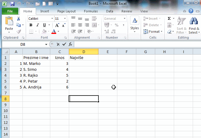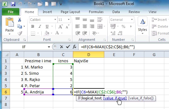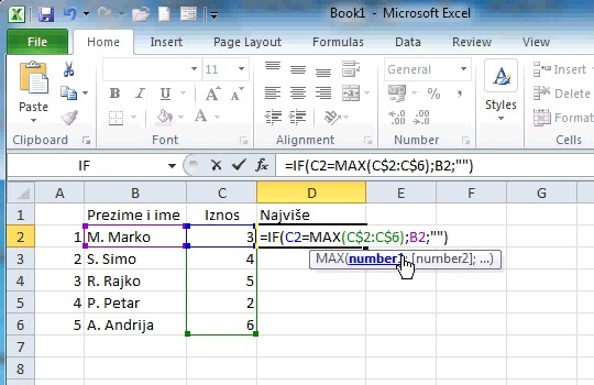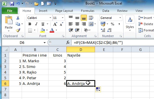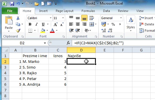 - Ispisati izraz u ćeliji D2 =IF(C2=MAX(C2:C6);B2;"").