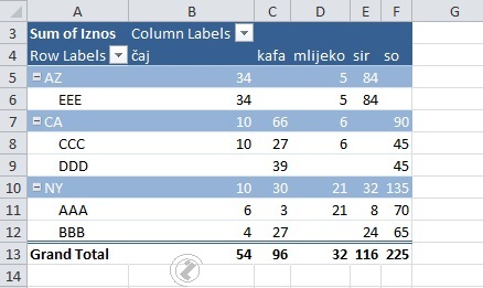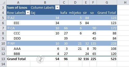 Prikaz konačnog zbira svih kolona-redova /GRAND TOTAL/, postupak:
