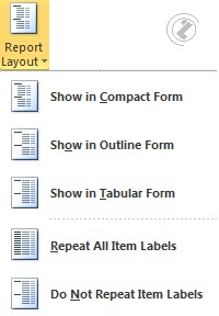 Kod Pivot tabela postoji više oblika prikaza Pivot tabele /PIVOT TABLE REPORT LAYOUT/. Iz PIVOT TABLE TAB, izabrati DESIGN TAB a iz LAYOUT grupe izabrati REPORT LAYOUT dugme.