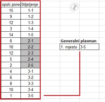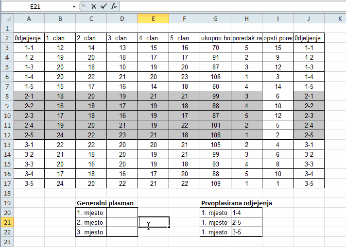 VLOOKUP - HLOOKUP Za ostvareni broj bodova članova ispisati prvoplariana odjeljenja pojedinih razreda. VLOOKUP funkcija omogućuje traženje određenje vrijednosti u opsegu i ispisa sadržaja nađenog reda izabrane kolone. Prvi parametar funkcije je vrijednost koja se traži (u ovom slučaju 1), zatim opseg u kojem se traži vrijednost, treći parametar kolona iz koje će se vršiti ispis nađenog reda i četrvti parametar je da li se traži tačna vrijendost ili prva manja od navedene (u ovom slučaju traži se tačna vrijednost te je parametar 0), Za traženje prvo plasirano odjeljenja prvog razreda formula je: Za drugi razred prvoplasirano odjeljenje: za treći razred prvoplasirano odjeljenje: