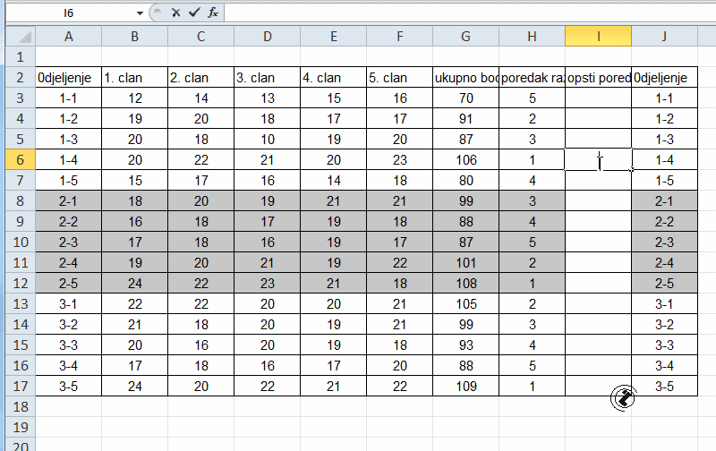 Za ostvareni broj bodova članova rangirati odjeljenje unutar svih razreda.