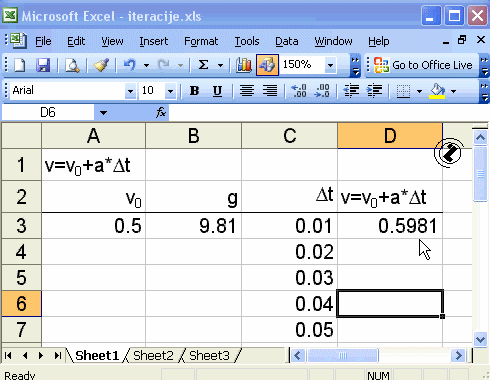 Primjer korištenja EXCEL-a za izračunavanja trenutnih brzina po formuli: