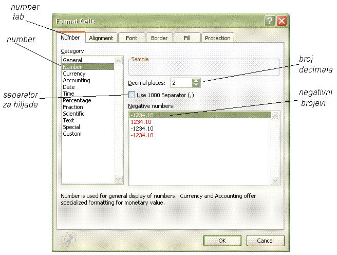 Parametri broja se u EXCEL-u podešavati u NUMBER grupe trake /RIBBON/ ili u FORMAT CELLS - NUMBER dijalog prozora.