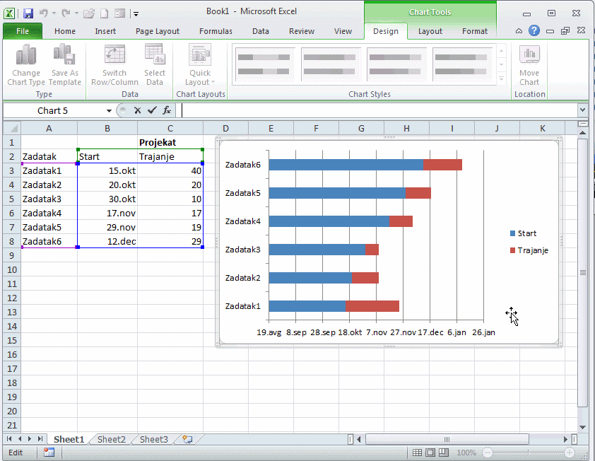 Prikazivanje podataka u GANTT dijagramu je prikazana korak po korak.