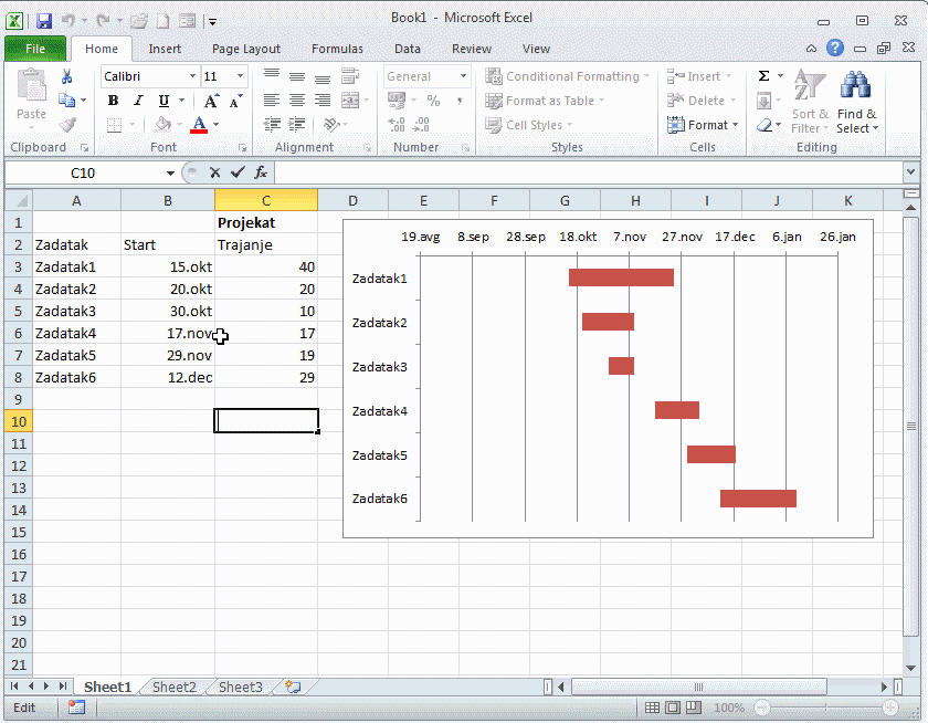 Prikazivanje podataka u GANTT dijagramu je prikazana korak po korak.