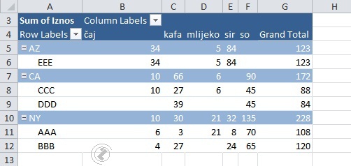 Prikaz konačnog zbira svih kolona-redova /GRAND TOTAL/, postupak: