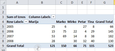 Za podatke kreirati Pivot tabelu: Kolone godine, redovi Prodavači i ostavarani iznosi. Kreirana Pivot tabela izgleda kao na slici.