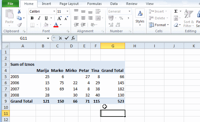 Ime Pivot tabele možemo promijeniti u traci /RIBBON/ upisom u polju PivotTabele Name.