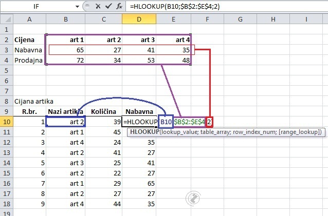 Slika 2. Sadržaj čelije D10=HLOOKUP(B10;$B$2:$E$4;2) |