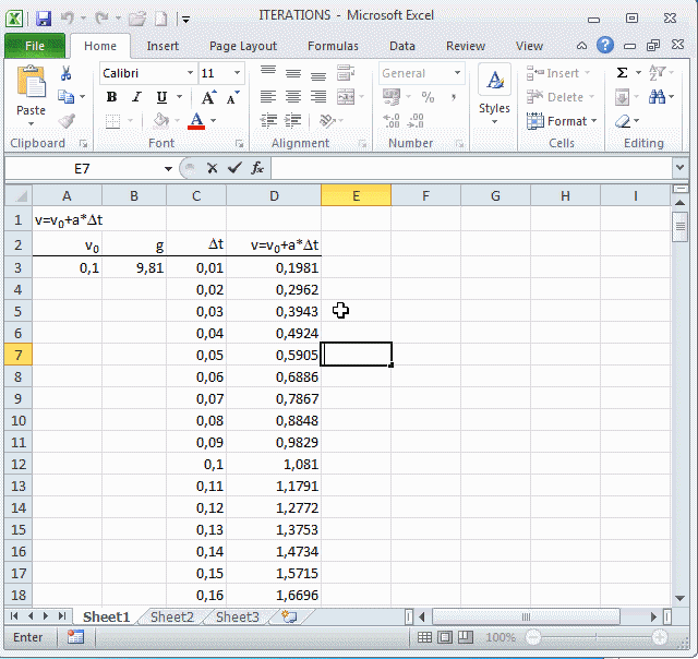 Primjer korištenja EXCEL-a za izračunavanja trenutnih brzina po formuli: