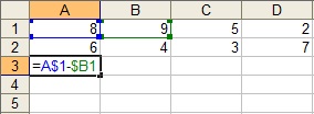 Sadržaj ćelije A3 je =A$1-$B1. Ako se iskopira u ćeliju C3 vrijednost ćelije će biti