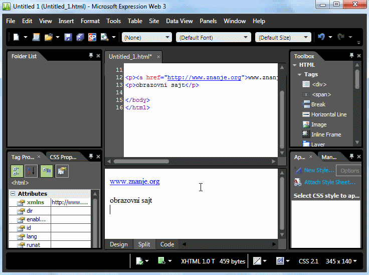 1. Postaviti pokazivač miša na SPLIT LINE - između DESIGN i CODE prozora.