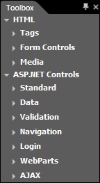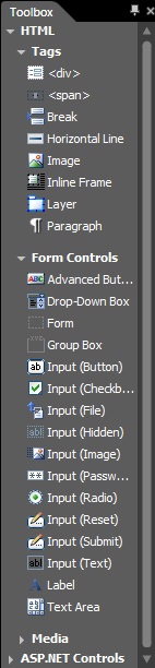 EXPRESSION WEB omogućava da se iz TOOLBOX PANE-a kopiraju elementi na razvojnu površinu /DEVELOPMENT AREA/ DRAG & DROP metodom. TOOLBOX PANE se otvara iz PANE menija >>.