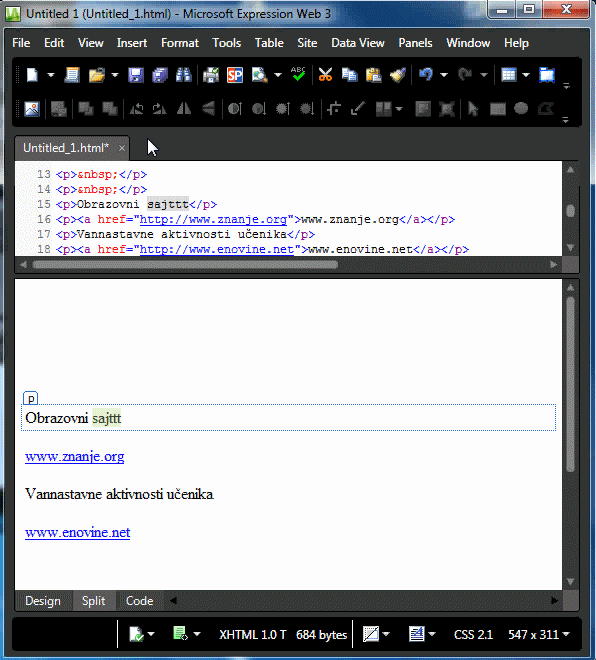 7. EXPRESSION WEB pozicionira kursor na taženi tekst.