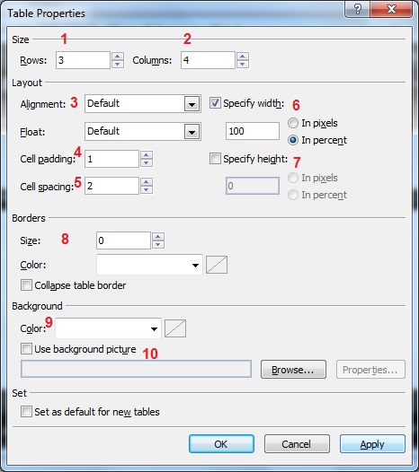 Kreiranje tabele /INSERT TABLE/ se bira iz TABLE menija, INSERT TABLE opcija. INSERT TABLE dijalog prozor se otvara. biraju se broja redova (1 na slici 1) i kolona (2 na slici 1) tabele.