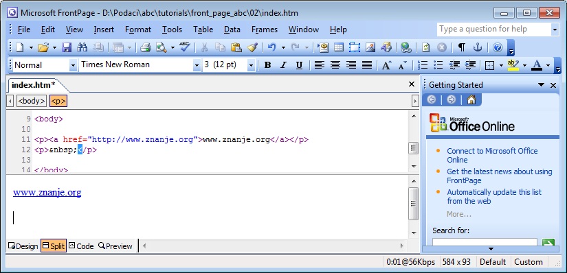 Uvod /INTRODUCTION/ FRONT PAGE je aplikacija (alat) za izradu Web (html) sadržaja. Sastavni je dio MICROSOFT OFFICE paketa. Dokumenti kreirani u FRONT PAGE-u imaju .htm ili .html ekstenziju. Za pregled sadržaja Web dokumenata (a i dokumenata izrađenih FRONT PAGE-u) koriste se aplikacije koje se zovu čitaći /BROWSER(S)/. Primjeri ovih aplikacija su: INTERNET EXPLORER, MOZILLA FIREFOX, OPERA,... Okruženje FRONT PAGE-a je slično WORD-u i većina korisnika FRONT PAGE-a već poznaje rad sa WORD-om, kao i osnove WINDOWS okruženja (prozor, ikona dijalog prozor, meni, WINDOWS EXPLORER,...). Na našem sajtu www.znanje.org se nalaze uputstva za Word i WindowsXP kao i druga uputstva abc serije: abc Tutorials: Ovo je priručnik za početnike /BEGINNER/. Podijeljen je u oblasti: