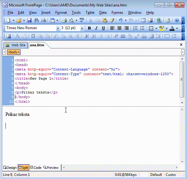Promjena naslova dokumenta /TITLE/ FILE meni PROPERTIES opcija Promjena naslova dokumenta /TITLE/ se izvod izborom FILE menija pa opcija PROPERTIES opcija. Prvi dio animacije je provjera naslova koji je uobičajeno "New Page 1". Potom se izvodi promjena naslova dokumenta.