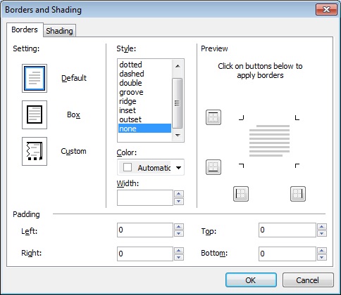 Okvir /BORDERS/ - dijalog prozor 1 Okvir /BORDERS/ se postavlja i iz BORDERS AND SHADING dijalog prozora koji se otvara iz FORMAT menija.Korisnik može da bira parametre okvira (koju stranu okvira da se prikaže, debljinu linije, boju kao i udaljenost od teksta.
