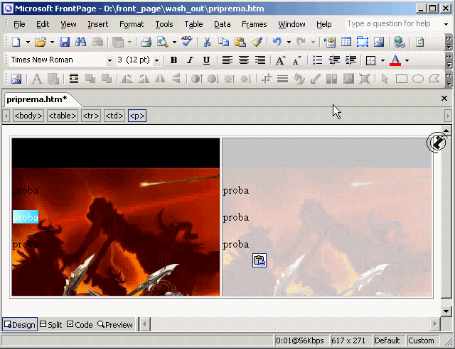 Prikaz ispisa teksta u različitim bojama fonta na originalnoj i ispranoj slici kao pozadini ćelije u FRONT PAGE-u, postupak: