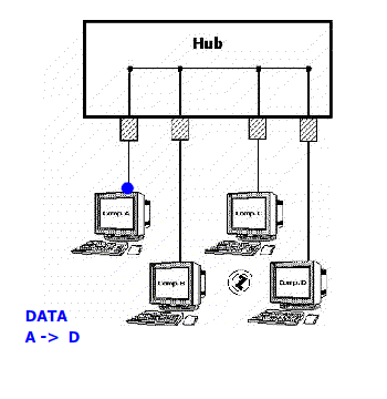 Ulaz/izlaz u HUB se zove port i ravnopravni su - može se svaki uredjaj priključiti na bilo koji ulaz. |