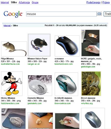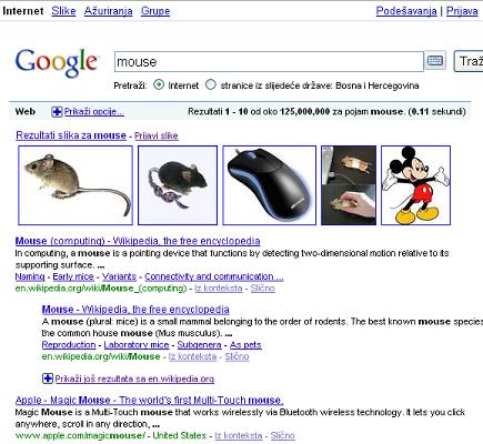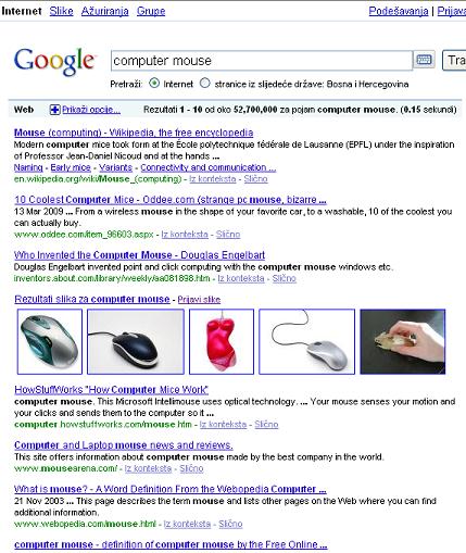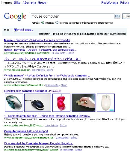 abc Internet osnove Za brzo pronalaženje sadržaja osm dobre mmašine potrebno je da dobar način postavaljanja upitA /QUERY/. Pričitajte upotsva: Na mnogim lokacijama se nalaze upitstva za korištenje mašina za pretraživanje. Korisne informacije možete tu naći. Budite jasni ali kratki: Upit treba dasadrži dovoljno riječi da bi se razultati nalazili na vrhu spiska. Ako ima previše riječi može se desiti da se tražena strana nađe tek na kraju spiska. Počnite sa nekoliko riječi a zatim postepeno dodajte nove i njima zamjenljive riječi da bi dobili bolje rezultate. Slijedeći primjer sadrže rezultate naizgled istog upita - taraženje miša /MOUSE/.