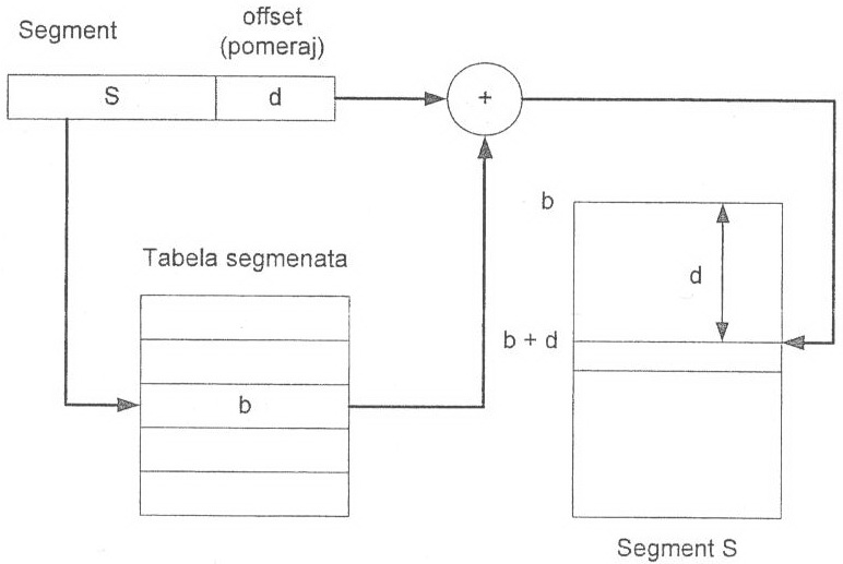 Na slici 4 je prikazano preslikavanje logičkih adresa pomoću tabele segmenata. Bazna adresa za dati segment S u fizičkoj memoriji je označena sa b. Dužina (veličina) segmenta je l. Pomjeraj unutar segmenta je označen sa d.