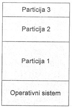 Upravljanje memorijom pomoću statičkih particija je jedan od najosnovnijih načina upravljanja memorijom. Za višeprogramski rad neophodna je dodjela više particija. Memorija se dijeli u particije fiksne veličine, kao što je to pokazano na slici 1. Particije su fiksirane u vrijeme inicijalizacije sistema i ne mogu se mijenjati u toku izvršavanja programa. Svakoj particiji se dodjeljuje po jedan proces. Programi se raspoređuju tako da budu smješteni u najmanjoj particiji koja je dovoljno velika da prihvati cio program. Izvršni program koji je pripremljen za izvršavanje u datoj particiji ne može da se izvršava u nekoj drugoj particiji bez ponovnog povezivanja (eng. relinking).
