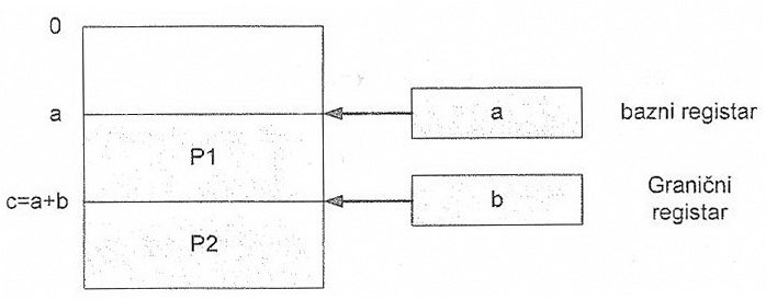 Hardverska zaštita memorije se može ostvariti korišćenjem dva registra koji se zovu: bazni (eng. base) i granični (eng. limit) registar. U baznom registru se nalazi najmanja adresa fizičke memorije gdje je dati program smješten, dok se u graničnom registru nalazi veličina opsega memorije unutar koga program može pristupati, kao što je to prikazano na slici.