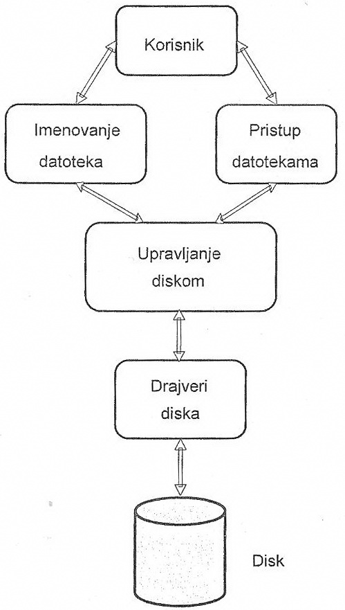 Sistem za upravljanje podacima upravlja radom sekundarne memorije i može se dekomponovati na logički i fizički sistem za upravljanje podacima. Postoje dva odvojena aspekta sistema za upravljanje podacima: interfejs ka krajnjem korisniku i implementacija. Interfejs obuhvata datoteke i direktorijume, a implementacija fizičku organizaciju podataka. Na slici 1 su prikazane komponente sistema za upravljanje podacima.