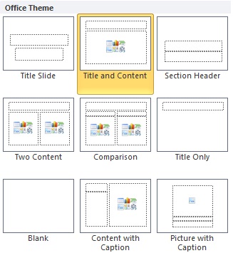 Novi slajd se može dodati iz HOME TAB, klikom na strelicu uzNEW SLIDE dugme . Zatim se bira SLIDE TYPE.