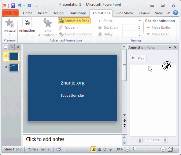 ANIMATION PANE nestaje kad se izbere ANIMATION PANE dugme u ANIMATION traci /TAB/.