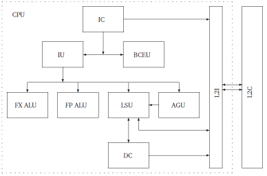 Globalne funkcije funkcionalnih jedinica mikroprocesora su: BCEU Branch Control Element Unit. Ova jedinica se koristi pri obradi zahtjeva za podacima i instrukcijama iz keš memorije, prevođenje virtualnih u apsolutne adrese, pri implementaciji preklapanja instrukcija, itd. Pored toga ova jedinica sadrži i mikrokod. IU Instruction Unit se koristi za dekodiranje instrukcija i određivanje njihovih komponenti. AGU Address Generation Unit se koristi za generisanje adresa koje treba sačuvati ili sa kojih treba napuniti vrijednosti. LSU Load/Store Unit se koristi za prijem i čuvanje podataka pri njihovom čitanju/upisu u L1 keš za podatke. Takođe obezbjeđuje poravnanje, konverziju između zapisa brojeva različitih dužina, kao i (na nekim mikroprocesorima) normalizaciju brojeva u pokretnom zarezu. FX ALU FiXed point ALU vrši operacije sa brojevima u fiksnom zarezu (cjelobojnim i BCD) kao i logičke operacije. FP ALU Floating Point ALU vrši operacije sa brojevima u pokretnom zarezu. Kod nekih mikroprocesora se ova jedinica koristi za izvršavanje dodatnih skupova instrukcija (npr MMX), dok je kod drugih mikroprocesora jedinica koja izvršava ove dodatne skupove instrukcija (npr. SSE ili AltiVec) po strukturi slična FP ALU i vrlo blisko povezana sa njom. DC Data Cache. L1 Keš za podatke. IC Instruction Cache. L1 Keš za instrukcije. L2I Cache Level 2 Interface. Veza ka kešu na nivou 2. L2C Level 2 Cache. Keš na nivou 2. Formalno gledano, on se nalazi van CPU-a i sa njim je povezan posebnom magistralom. Jedinice su međusobno povezane internim vezama koje se nazivaju interne magistrale procesora. Većina jedinica posjeduje svoje interne bafere. Registri u procesoru nisu grupisani na jednom mjestu već su distribuirani prema svojoj namjeni.