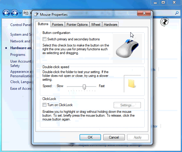 - Otvaranje MOUSE PROPERITES prozora (otvaranje animacija ...).