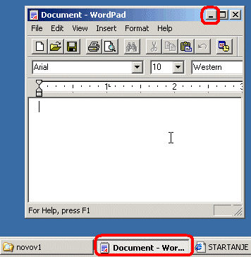 Klikom na dugme MINIMIZE /MINIMIZE BUTTON/ prozor se smanjuje prozor aplikacije na dugme aplikacije u listi poslova /TASKBAR/.