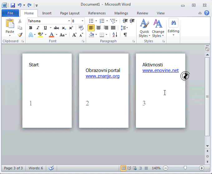 Kod pojedinih radova potrebno je da tek treća stranice ima numeraciju 1. Princip je kreirati novu sekciju zatim u HEADER AND FOOTER TAB-u isključiti LINK TO PREVIOUS dugme u NAVIGATION grupi..
