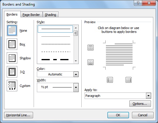 Okvir /BORDERS/ se bira iz traka/RIBBON/ klikom na dugme BORDERS iz PARAGRAPH grupe u HOME traci /HOMER TAB/.